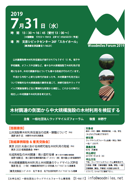 一般社団法人ウッドマイルズフォーラム(東京都文京区)は、ウッドマイルズフォーラム2019「木材調達の側面から中大規模施設の木材利用を検証する」を、7月31日に文京シビックセンター(東京都文京区)にて開催する。
