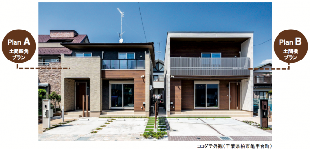 「ココダテ」は、入居申し込みの時期によって間取りプラン、外観、設備グレード、デザインテイスト、アクセントクロスが選べるほか、住宅購入コストや固定資産税、修繕などの維持費がかからない賃貸住宅のメリットも備えた、賃貸住宅の新しいカタチを提案するもの。今回完成した2棟は、それぞれ特徴的な土間スペースを備えた「土間四角プラン」と「土間横プラン」となっている。