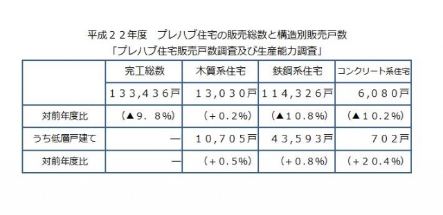 社団法人プレハブ建築協会(東京都千代田区)は、プレハブ住宅メーカー100社を対象に、平成22年度(平成22年4月〜23年3月)の販売動向・生産能力を調査した。