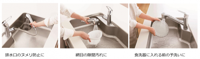 クリーンシリーズ(JL3)は、タカギ独自の技術である水形6段切り替えを搭載。ストレート、シャワー、クリーンシャワーの3つの水形を浄水と原水それぞれで切り替えることができる。中でもクリーンシャワーは新しく開発した水形で、水径が広範囲に広がり、かつ水勢も強く、鍋やフライパンにこびりついた汚れや排水溝のヌメリの清掃に便利。従来品との洗浄所要時間で比較したところ、約40%の時短が可能になったという。また、浄水カートリッジは、JISで定められた13の除去対象物質に加え、鉄とアルミニウムの除去にも対応する。
