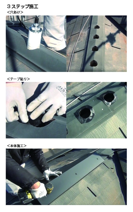 施工は、穴あけ・テープ貼り・留め付けの3ステップ(上)。