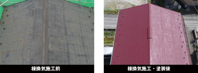 塗装した屋根と同じ色に棟換気を塗装することができる(下)