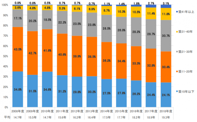 中古住宅の平均築年数は、中古戸建で19.3年、中古マンションで23.7年となり、ともに長期化が進んだ。築21年以上の割合は、中古戸建で45.6%、中古マンションで55.5%となった。