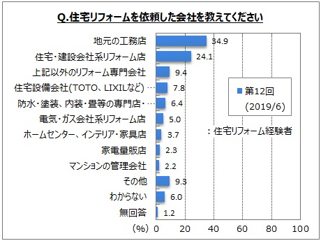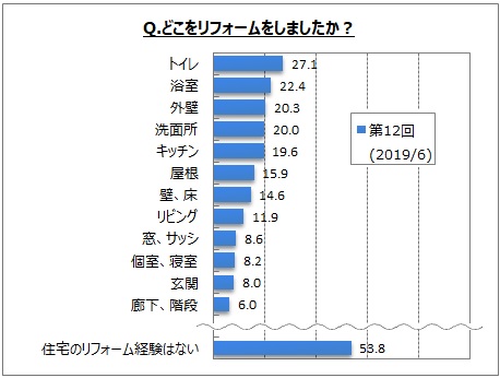 住宅のリフォーム経験を聞いたところ、経験者は全体の5割弱。現在の住居形態別でみると、「持ち家一戸建て」居住者では5~6割、「持ち家集合住宅」居住者では5割弱が経験者だった。リフォーム箇所は、「トイレ」「浴室」「外壁」「洗面所」「キッチン」などが各2~3割。住宅リフォームを依頼した会社は、「地元の工務店」が34.9%、「住宅・建設会社系リフォーム店」が24.1%だった。