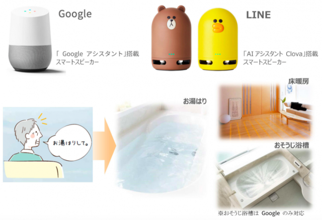 同社の専用「わかすアプリ」と各社スマートスピーカーの連携により、「自動お湯はり」「追いだき」「床暖房」「おそうじ浴槽」の音声操作が可能になる。音声操作に対応する機能は各社のスマートスピーカーで異なっており、LINEでは「おそうじ浴槽」、Googleでは「追いだき」が未対応となる。