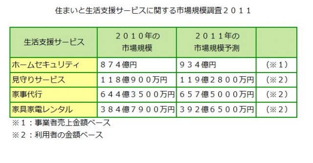 それによると、見守りサービスの2010年市場規模は118億900万円にのぼった。見守りサービスとは小型端末により遠隔地にいながらひとやペット、家財の異常を察知するシステム。単身世帯の増加を受けて市場が拡大傾向にあることから2011年は119億2800万円(前年比101.1%)と予測する。