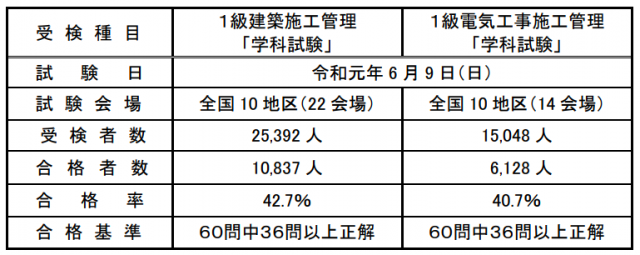 国土交通省は7月19日、2019年度の1級建築・電気工事施工管理技術検定「学科試験」の合格者を発表した。建築施工管理の学科試験は、受験者が2万5392人、合格者が1万837人、合格率が42.7%。電気工事施工管理の学科試験は、受験者が1万5048人、合格者が6128人、合格率が40.7%だった。