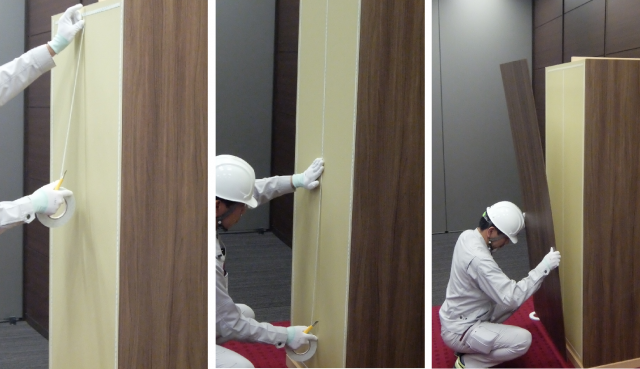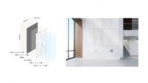 テープをはがすときも剥離紙が途中で切れることなく一気にはがせるよう改良した。従来の内装パネルは、仮止めテープを施した上で、接着剤を使って施工していたが、両面テープのみで施工できるようになったことで、作業工程が減り、施工時間の短縮や作業者の負担軽減、接着剤の管理経費の削減になり、同社の試算では人件費などのコストが15%以上低減するという。