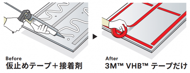 VHBテープは同社が30年以上前から販売している強力両面テープ。新製品は、これまでのVHBテープよりもさらに粘着強度を高め、石膏ボード、メラミン化粧板、アルミ複合板など幅広い材質に接着できる建築パネル仕上げ専用の両面テープとして発売する。