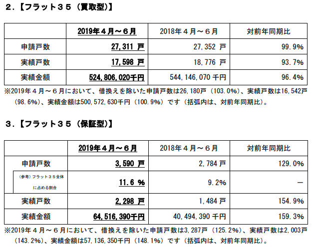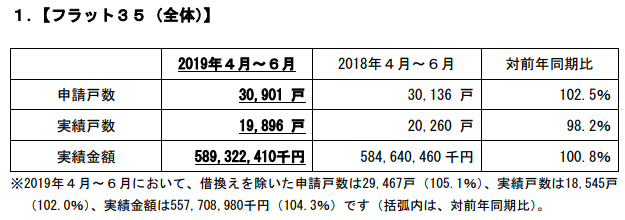 住宅金融支援機構(東京都文京区)は7月26日、2019年4〜6月分の「フラット35」申請戸数等を発表した。全体の申請戸数は前年同期比102.5%の3万901戸、実績戸数は同98.2%の1万9896戸、実績金額は同100.8%の5893億2241万円だった。