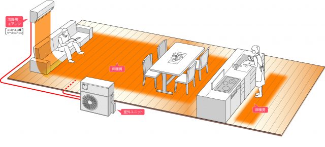 コロナ(新潟県三条市)は、室外ユニット1台で夏はエアコン冷房、冬は床暖房+エアコン暖房を併用できるエアコン付きヒートポンプ床暖房「コロナエコ暖クールエアコン」2機種を6月から7月にかけて順次発売している。室外機の設置スペースが小さい場所にも置くことができる。