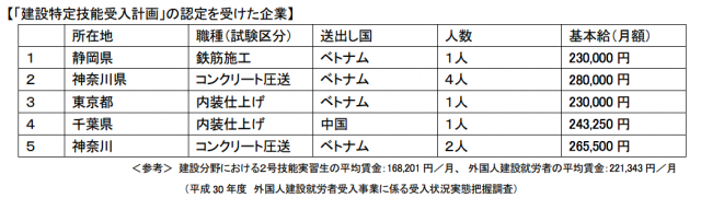 認定を受けた計画の内訳を見ると、職種では鉄筋施工が1人、コンクリート圧送が6人、内装仕上げが2人。送出し国はベトナムが8人、中国が1人だった。