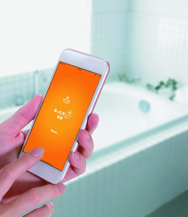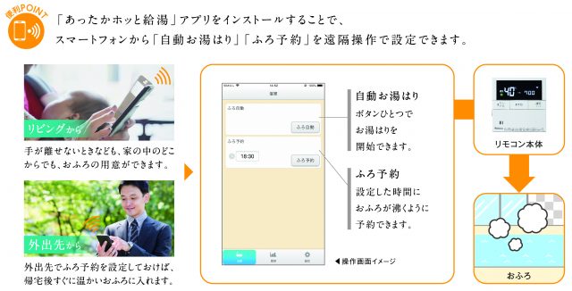 専用アプリ「あったかホッと給湯」(8月1日サービス開始)をインストールしたスマホを使うことで、屋内外から遠隔操作で給湯器の「自動お湯はり」や設定時間にお風呂をわかす「ふろ予約」が可能に。