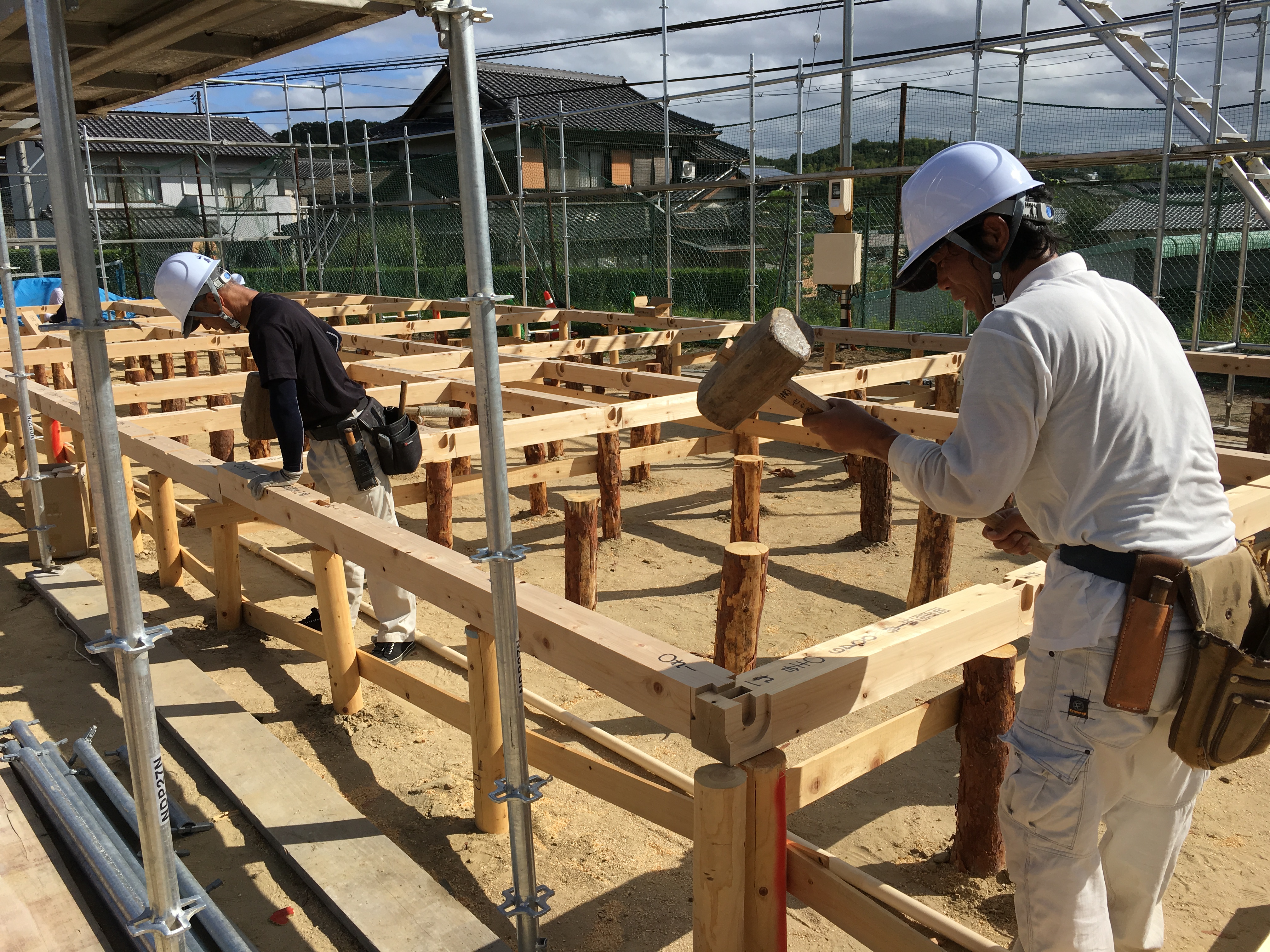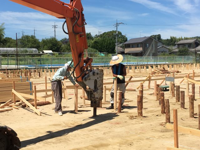 8月2日、プレハブ住宅では建築が困難と判断された2団地について、全木協、岡山県、国交省の職員立ち会いのもと、現地測量を実施。熊本や広島の全木協支部と連携を取りながら作成した仕様図面、見積金額を9日に県に提出した。プレハブ住宅を建築する県内の他団地が9日から次々と着工するなか、全木協が県から工事着手決定の連絡を受けたのは11日夜。これを受け8月15日に木杭打ちを着工し、9月24日までの竣工に向けて猛スピードで工事に取り掛かった。