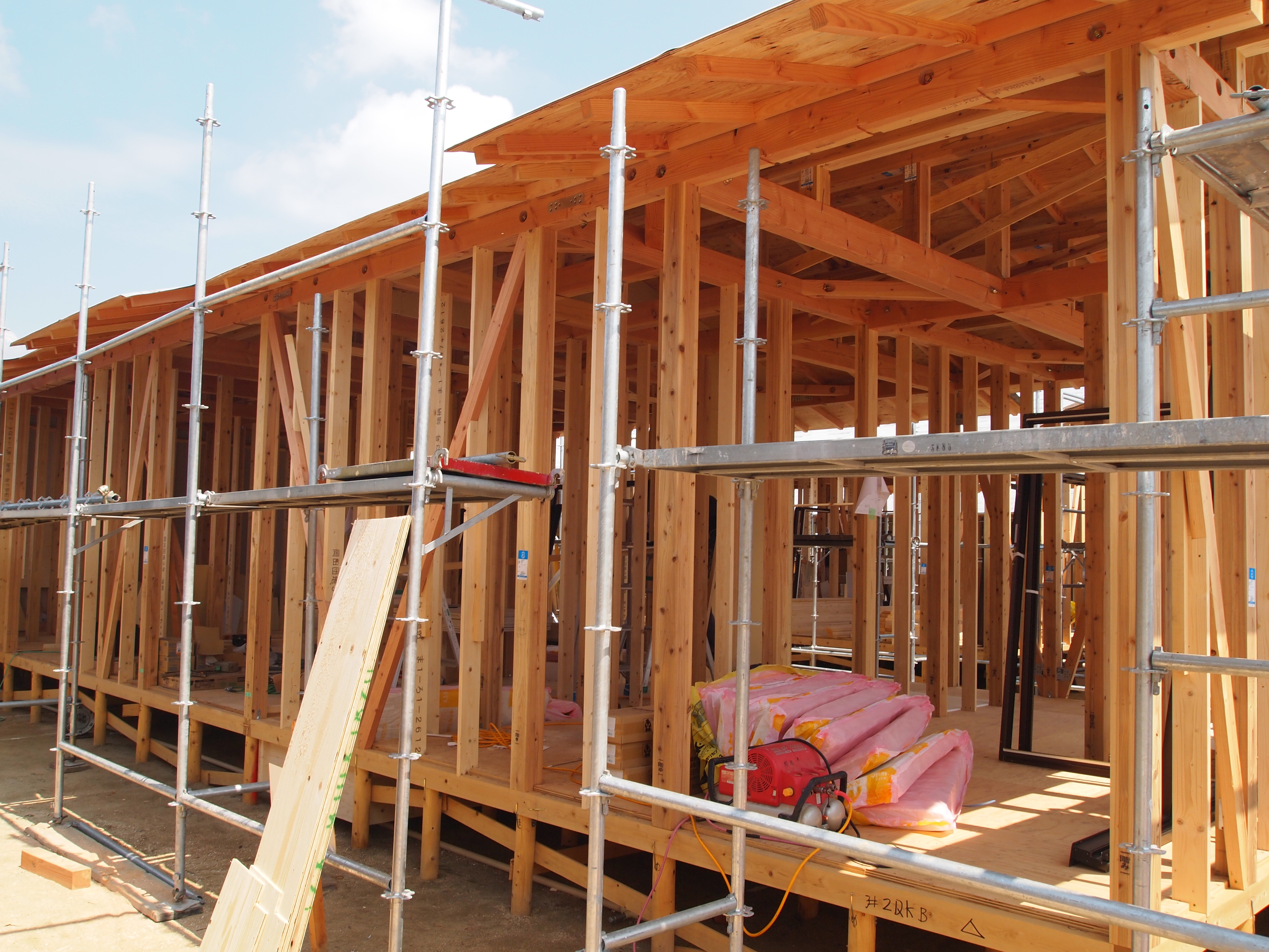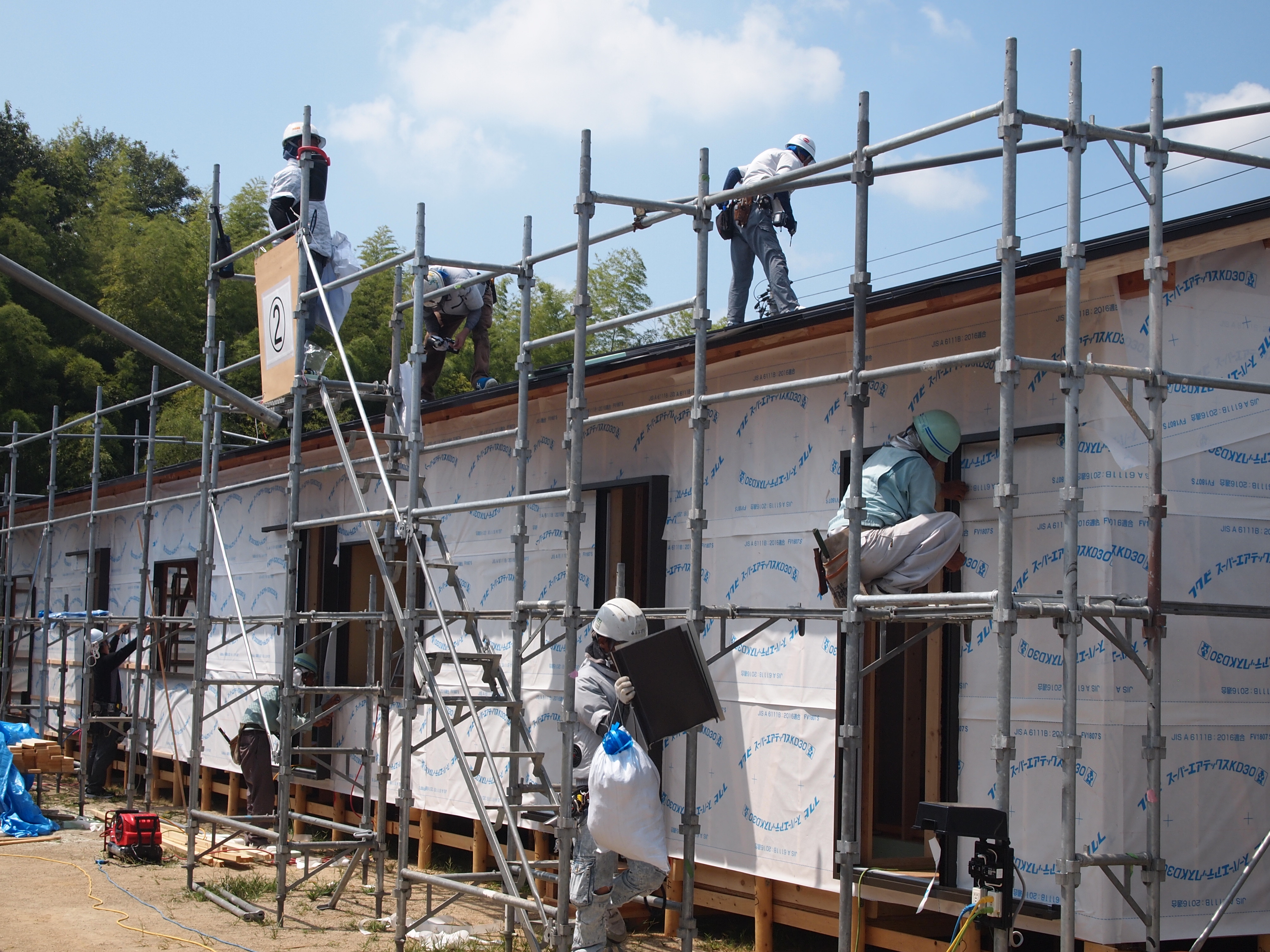 とくに木工事では2団地で70人以上の職人が一斉に作業する中、効率よい現場運営のしくみがカギとなった。毎朝8時の作業開始前に朝礼を行い、班振分けや一日の作業確認をした。職人から意見や提案も聞き、決定事項を全員に伝達した。現場生産効率化を図るため、木工事は各3人1チームで行い、各団地には現場監督2人のほか、大工から職長1人を指名して全体の総監督を担ってもらった。