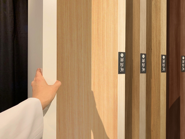 今回、重厚感や高級感の体感のため、厚みを36mmから世界的な基準である40mmへと変更。ドアの厚みが増したことで、熱を照射し、強制的に反りを発生させる過熱照射試験で、反り性能が高まったことを試験で実証した。1m2あたり700キロカロリーの熱量を3時間ドア全体に照射する試験で、一般的なドアが約15mmの反り量だったのに対し、フルハイトドアでは約5mmと3分の1程度に抑えられた。さらに6時間後には反り量が0mmに戻ったという。