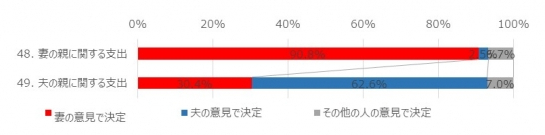 親に関する支出では、妻の親に関する支出は妻の意見、夫の親に関する支出は夫の意見で決定する一方、妻の親に関する支出の夫の意見は2.5%、夫の親に関する支出の妻の意見は30%となり、親についての支出は妻の意見が大きかった。