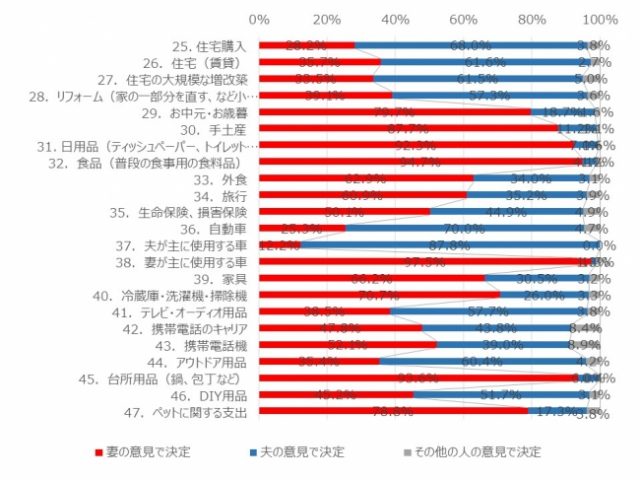 家庭内で使う23品目のうち、妻の意見で購入決定しているのは14品目。住宅関連の支出は夫の影響が大きいが、賃貸・増改築・リフォームについては妻の意見が4割近かった。車については、妻が主に使用する車への夫の意見に対して、夫が主に使用する車への妻の意見の割合が高かった。ペットに関する支出は、妻の意見で決定するという回答が8割近かった。