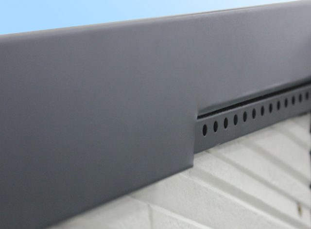 軒ゼロ住宅のシンプルな外観はそのままに、暴風雨時の雨の浸入を防ぎながら、妻側外壁内の湿気を外壁上部で排気して外壁内の結露を防ぐ通気見切り部材。