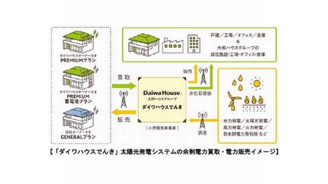 電力販売は、各電力会社の単価より3%下げた同社の戸建て住宅オーナー向け販売メニューと他社の戸建て住宅オーナー向けの販売メニューを用意。買い取った余剰電力の非化石価値は、「RE100」加盟企業や環境意識の高い戸建て住宅オーナーに販売するほか、同社グループの工場・事業所などで活用の予定とする。