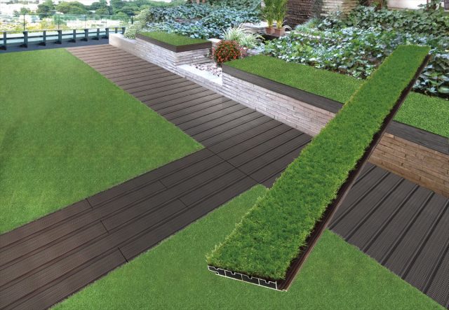 セイキ総業(東京都練馬区)は8月、セラミック・竹・人工木の3素材・10種類から好みのデッキ面材が選べる「選べるデッキ(ELAVEL DECK)」を拡充。ハイグレードな人工芝・天然石を追加して「選べるデッキ プラス」として発売した。