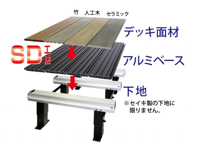 アルミベースを施工後、デッキ面材を並べて固定するSD工法を採用。全アイテム同一価格・同一規格で、複数素材を組み合わせて張ることもできる。