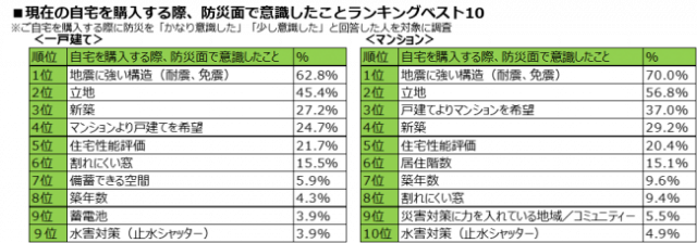「現在の自宅を購入する際、防災面で意識したこと」のランキングを見ると、一戸建て購入者、マンション購入者ともに、並びは異なるものの上位5項目で同じ項目がランクインした。6位は、一戸建てが「割れにくい窓」、マンションが「居住階数」となり、それぞれにこだわれることの項目が上位にランクインした。