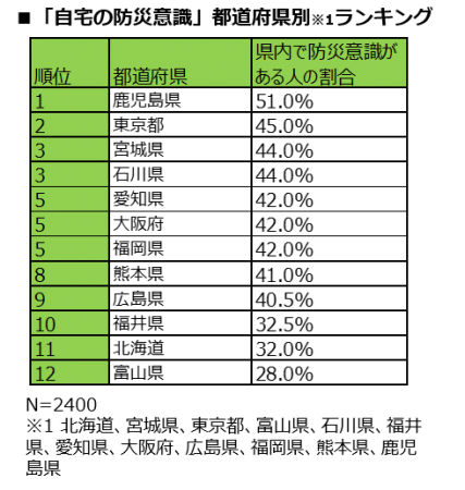 「現在の自宅を購入する際に防災を意識したか」という質問への回答を都道府県別に見ると、「意識した」「少し意識した」と答えた割合が一番高かった県は、台風が日本で一番多い鹿児島県(51%)だった。また、一番低かった県は、地震が少ない県といわれている富山県(28%)だった。