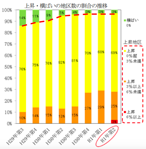 そのほか、商業系の「駅前通」(札幌市)、「中央1丁目」(仙台市)、「千葉駅前」(千葉市)、「歌舞伎町」・「渋谷」(東京都)、「太閤口」・「伏見」・「久屋大通駅周辺」・「金山」(名古屋市)、「京都駅周辺」・「河原町」・「烏丸」(京都市)、「中之島西」・「北浜」・「心斎橋」・「なんば」・「江坂」(大阪府)、「三宮駅前」(神戸市)、「博多駅周辺」(福岡市)、「下通周辺」(熊本市)、「沖縄県庁前」(那覇市)が前期に続いて3〜6%の上昇となった。
