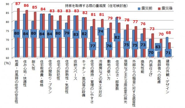 住宅検討者には住まい選びにおいて重視するポイントの変化を聞いた。震災前は「住宅の間取り」「住み心地、快適性」「住宅の取得費用、価格」がいずれも84%で上位を占めていたが、震災後は「地震・台風時の住宅の安全性(87%)」「冷暖房などの省エネルギー対応(81%)」「高齢者への配慮(70%)」が増加。デザインや広さ・部屋数などの重視度が下がった。