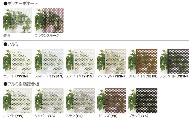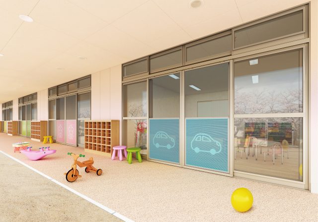 パンチングパネルは施設の特性に合わせ、透明なポリカーボネート、自由な色に焼付塗装できるアルミ、コスパのいいアルミ樹脂複合板の3種から選択可能。園舎向けにかわいいキャラクター柄14種、シンプルな幾何学デザイン14種を設定した。