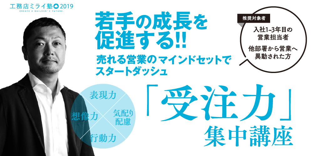 第1回/2019年10月31日(木) 【講義part1】:売れる営業・売れない営業 ・住宅営業必須の「気配り力」講座 ・住宅営業必須の「表現力」講座 【ワークショップ】 第2回/2019年11月28日(木) 【ワークショップ】 |