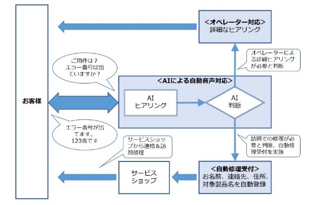 今回のシステムは、修理受け付けの業務をAIで自動化するもので、音声認識で「声」をテキスト化し、自然言語分類を使用して文脈や意味を解釈して、故障の原因や対処策を特定する。会話形式のヒアリングで、訪問修理が必要と判断すれば、対象の製品名や訪問先住所、電話番号などの登録までを自動で行う。また、詳細なヒアリングが必要な場合など、内容や状況にあわせて、自動応答とオペレーターによる対応を適切に配分することで、応対の迅速化と品質の向上につなげる。システム運用により、修理受け付けの約10%(年間6万件程度)の自動化を見込んでいる。
