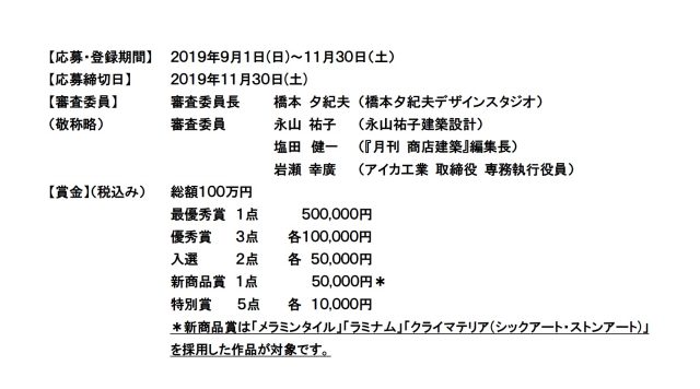 アイカ工業(名古屋市)は、同社商品を使った建築事例を対象とした「AICA施工例コンテスト2019」を開催。9月1日〜11月30日まで施工例を募集する。