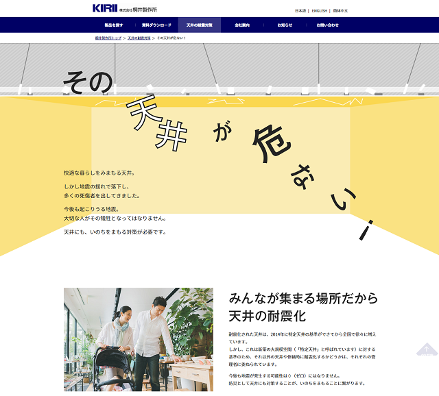 新耐震基準の建物において、天井の落下対策が進んでいないことから今回のリニューアルを実施。同社の耐震天井を知ってもらう「KIRII耐震天井とは?」ページを新設した。