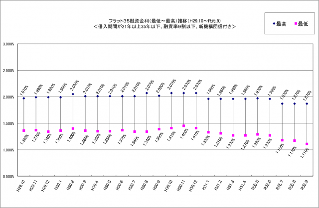 住宅金融支援機構(東京都文京区)が9月2日発表した、各金融機関の長期固定金利住宅ローン「フラット35」の9月分の金利は、主力の融資率9割以下・借入期間21年以上の場合で、年1.11%~年1.87%だった。最低金利は4カ月連続の下降となった。
