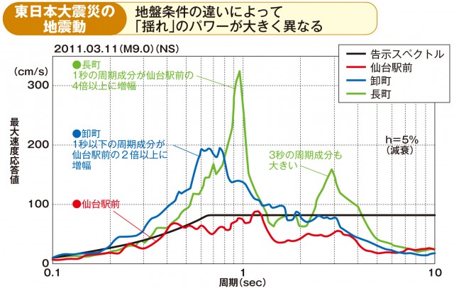 上のグラフは、東日本大震災の観測記録にもとづき、地震動が建物に及ぼす力を図式化して示したもの。横軸に周期を、縦軸に最大速度応答値(建物にどれだけの速度を与えるか)を取っている。卸町地区や長町地区では、1秒付近の周期成分が、仙台駅前の2倍~4倍に増幅していることが明らかだ。
