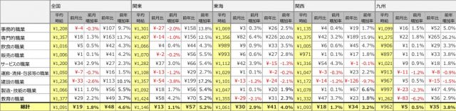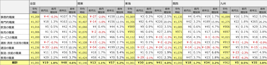 エリア別では、4エリアすべてで前年を上回り、職種別では、9職種中6職種が前月を上回った。