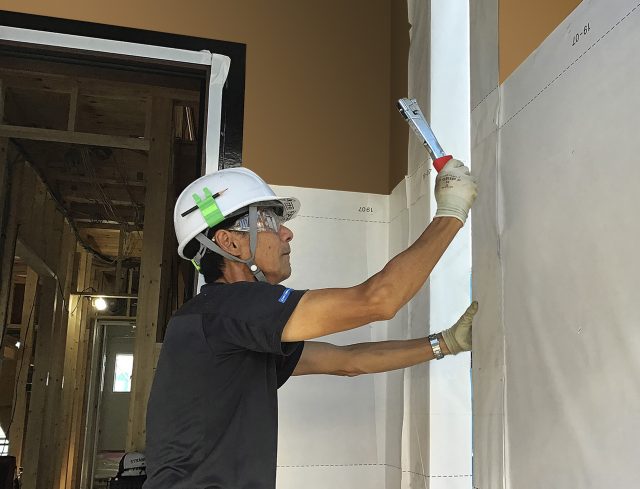 打ち込み時にハンドル先端が住宅部材と接触しないよう30度カットし、マガジン先端を平均打ち込み角度の15度で面取りすることで、接触面積が広がり力が逃げる構造とした。これにより、防水・透湿などの各種シートを破れにくくする。