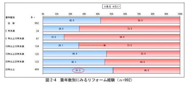 過去10年間のリフォーム経験を質問したところ、「ある」は42.0%、「ない」は58.0%。「ある」と答えた年代トップは60代だった。築年数別にみると、「築10年以上15年未満」(261.%)から「築15年以上20年未満」(46.4%)の間でリフォーム経験が「ある」との回答が大幅に伸長。