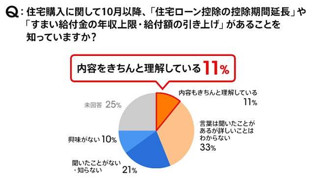 じぶん銀行(東京都中央区)はこのほど、同銀行口座保有者364人を対象に実施した「家庭のお財布事情」に関する調査結果を発表した。それによると「既婚者」154人のうち、消費税増税後の10月以降「住宅ローン控除の控除期間延長」や「すまい給付金の年収上限・給付額の引き上げ」があることを「きちんと理解している」人は11%であることがわかった。8割以上の人が「聞いたことはあるが詳しいことはわからない」「興味がない」と答えている。