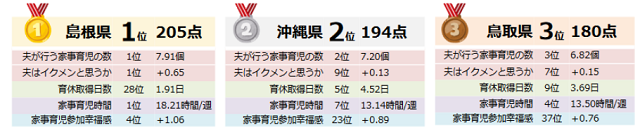 積水ハウス(大阪市)はこのほど、全国の小学生以下の子どもを持つ20代~50代の男女9400人を対象に実施した、男性の育休取得に関する調査結果を「イクメン白書」として発行した。同社は「配偶者評価」「育休取得日数」「家事育児時間」「家事育児参加幸福感」についてポイントを算出し、「イクメン力」ランキングを作成。47都道府県で、島根県が205点で1位となった。同県は、夫が行う家事育児の数(7.91個)と家事育児時間(週あたり18.21時間)、配偶者からの評価で1位を獲得。2位は沖縄県(194点)、3位は鳥取県(180点)だった。