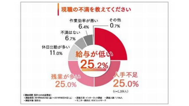 野原ホールディングス(東京都新宿区)は、建設業界の中でも残業が多く、労働時間の管理が難しいと言われている設計士を対象に「設計士の本音調査」を実施し、その結果を発表した。現職の不満として最も多かった回答は「給与が低い」(25.2%)だった。次いで「人手不足」(25.0%)、「残業が多い」(25.0%)となった。