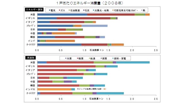 富士経済(東京都中央区)は、世界の住宅エネルギー需要動向の調査結果を発表した。調査は、北米、欧州、アジア・オセアニアの15カ国・地域を対象に実施。1戸あたりのエネルギー消費量が多かったのは、米国、ドイツ、オーストラリア、イギリス、デンマークなど。少なかったのは、タイ、インド、中国、台湾、スペインだった。日本は15カ国・地域のうち多い順で10番目だった。