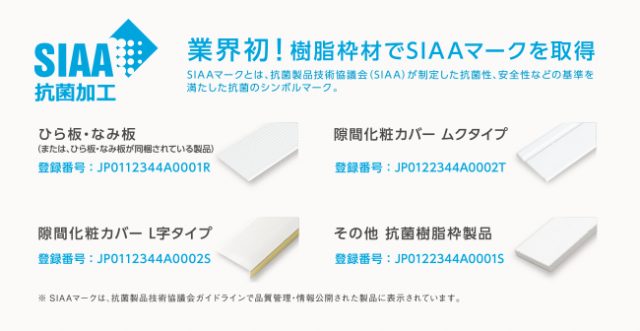 バスルーム、玄関などのドア枠や、トイレやリビングのカウンターとして使用できる樹脂製枠材。抗菌剤を練り込むことで、半永久的な抗菌性能をもたせた。抗菌製品技術協議会の規定を満たすSIAAマーク表示品。 また、化粧面をアクリルでコーティングしているため、傷つきにくい。