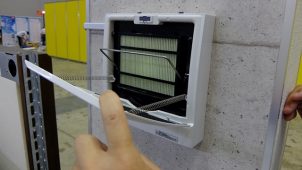 外気の温度に関わらず、快適な温度・湿度で給気する学校教室用の外気処理システム。新鮮空気を給気し、高性能フィルターで外気内の花粉・黄砂・PM2.5を除去するため、教室内の空気が汚れにくくなり、生徒たちの集中力を高めるという。