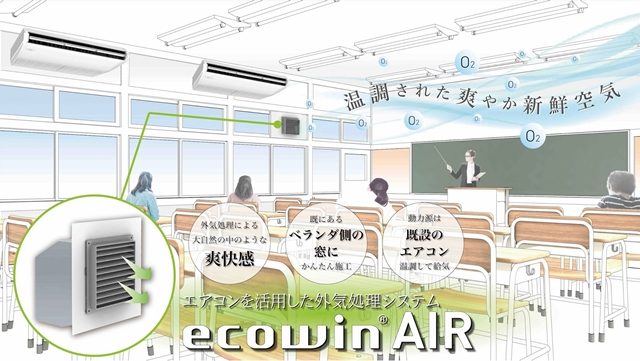 エコファクトリー(熊本市)は10月1日、既存のエアコンを熱源として利用し、本体を給気口とエアコンの冷媒管に接続することで温調・除湿・除塵した新鮮空気を室内に届ける外気処理システム「教室用ecowinAIR」を発売する。