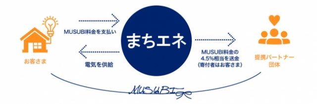 MUSUBI基本料金、MUSUBI電力量料金、再生可能エネルギー発電促進賦課金等と消費税等を合算した「MUSUBI料金」のうち、基本料金と電力量料金の4.5%相当分を、同社が提携するNPO法人(NPO法人HERO/認定NPO法人かものはしプロジェクト)へ送金することで、客が寄付者となり、毎月使う電気を通じて継続的な寄付を行うことになる。