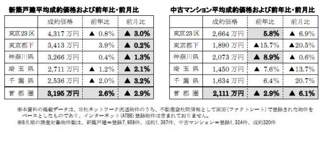 不動産情報サービスのアットホーム(東京都大田区)は、首都圏における2011年8月期の新築戸建て・中古マンションの価格を公表した。