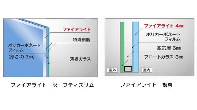 新製品のひとつ、「ファイアライト セーフティスリム」は、「ファイアライト」と薄板ガラスを特殊樹脂でポリカーボネートフィルムと張り合わせた構造。5mm厚の窓板ガラスとほぼ同じ重さで、防火や防犯の機能を持つ機能ガラス。